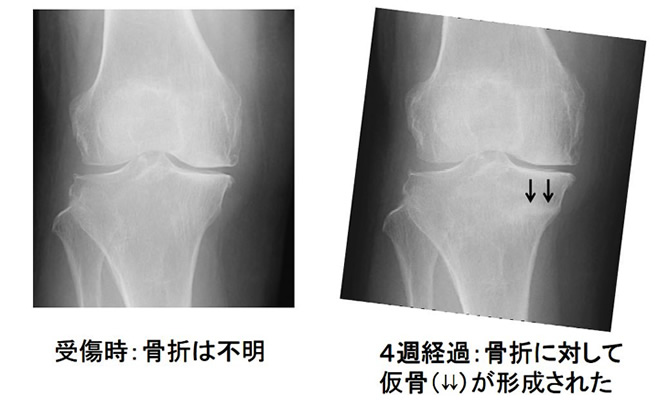 転倒なく通常の歩行で膝痛が生じた症例(脛骨不全骨折)