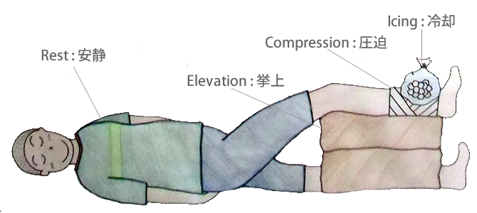 包帯やサポーターで圧迫。安静の意味も持ち、他との組み合わせでさらに効果的。 |