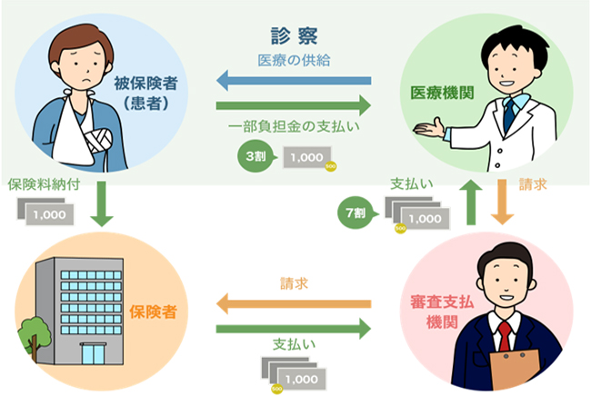 医療費(10割)のうち、患者様が医療機関に支払うのは、自己負担割合(3割負担など)に応じた医療費の一部です。