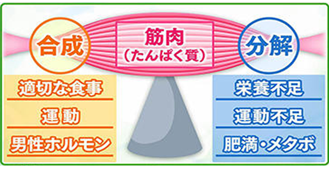 筋肉を効率よく増やすためには、運動とともに栄養が重要です。特に大切な栄養素が、たんぱく質です。筋肉はたんぱく質でできており、合成と分解が常に繰り返されていますので、食事でもたんぱく質をしっかりとり、合成を活発にすることが必要です。